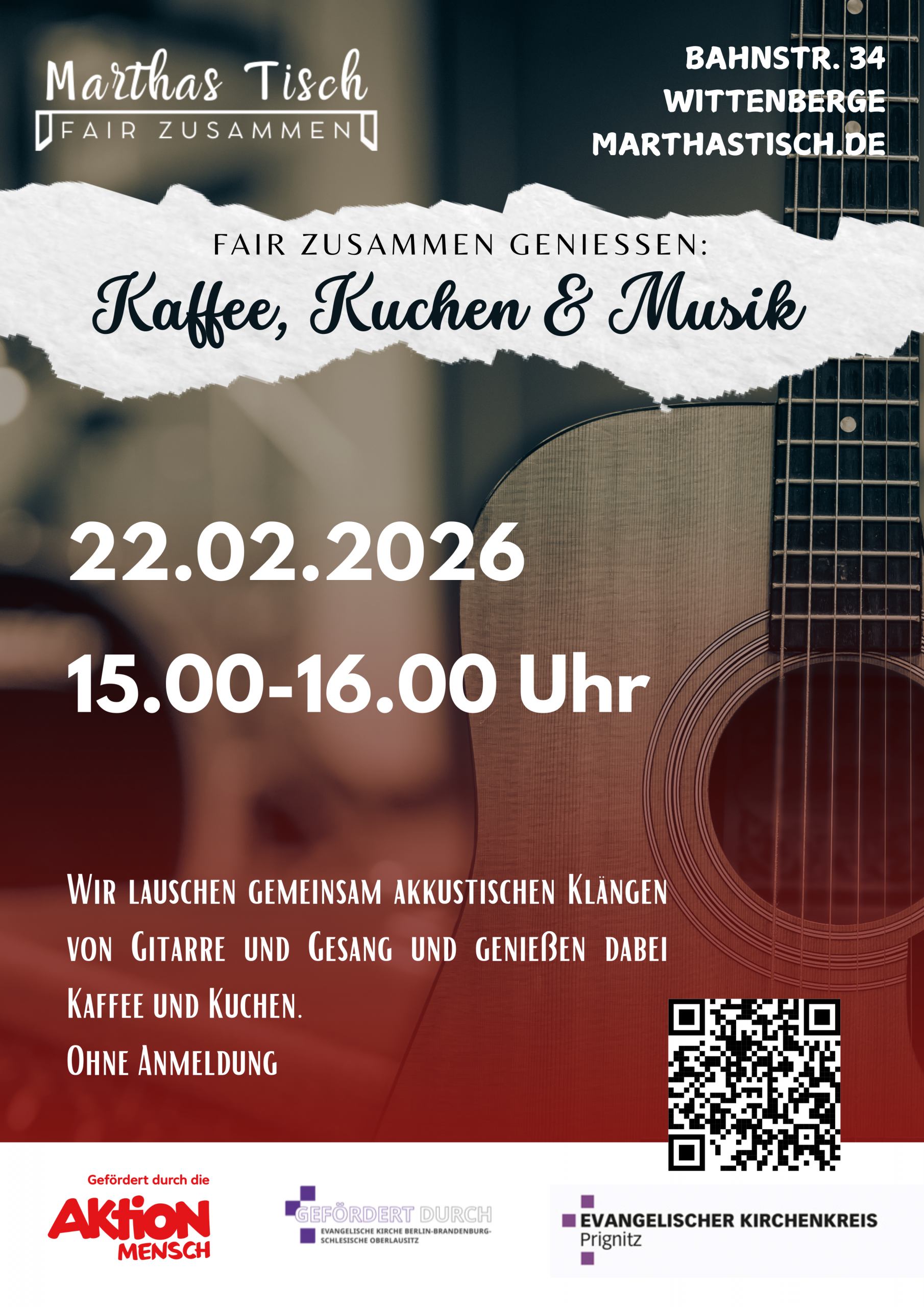 Genießen Sie mit uns einen entspannten Nachmittag bei Kaffee und hausgemachtem Kuchen. In gemütlicher Atmosphäre lauschen wir gemeinsam akustischen Klängen von Gitarre und Gesang – mal leise, mal lebendig, aber immer herzlich. Ohne Anmeldung