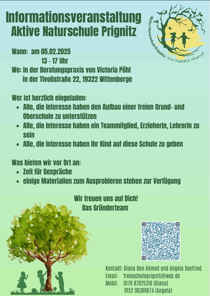 Bereits am Mittwoch, den 05.02.2025 findet ab 13:00 Uhr ein Infonachmittag in Wittenberge statt (nähere Infos sind dem Flyer zu entnehmen). Es werden auch in kurzer Zeit Interessenbögen zur Verfügung gestellt für alle Eltern, die ihr Kind /ihre Kinder unverbindlich ab dem Schuljahr 2026/27 dort anmelden möchten. Im QR-Code findet Ihr die Kontaktmöglichkeiten und Infokanäle.
