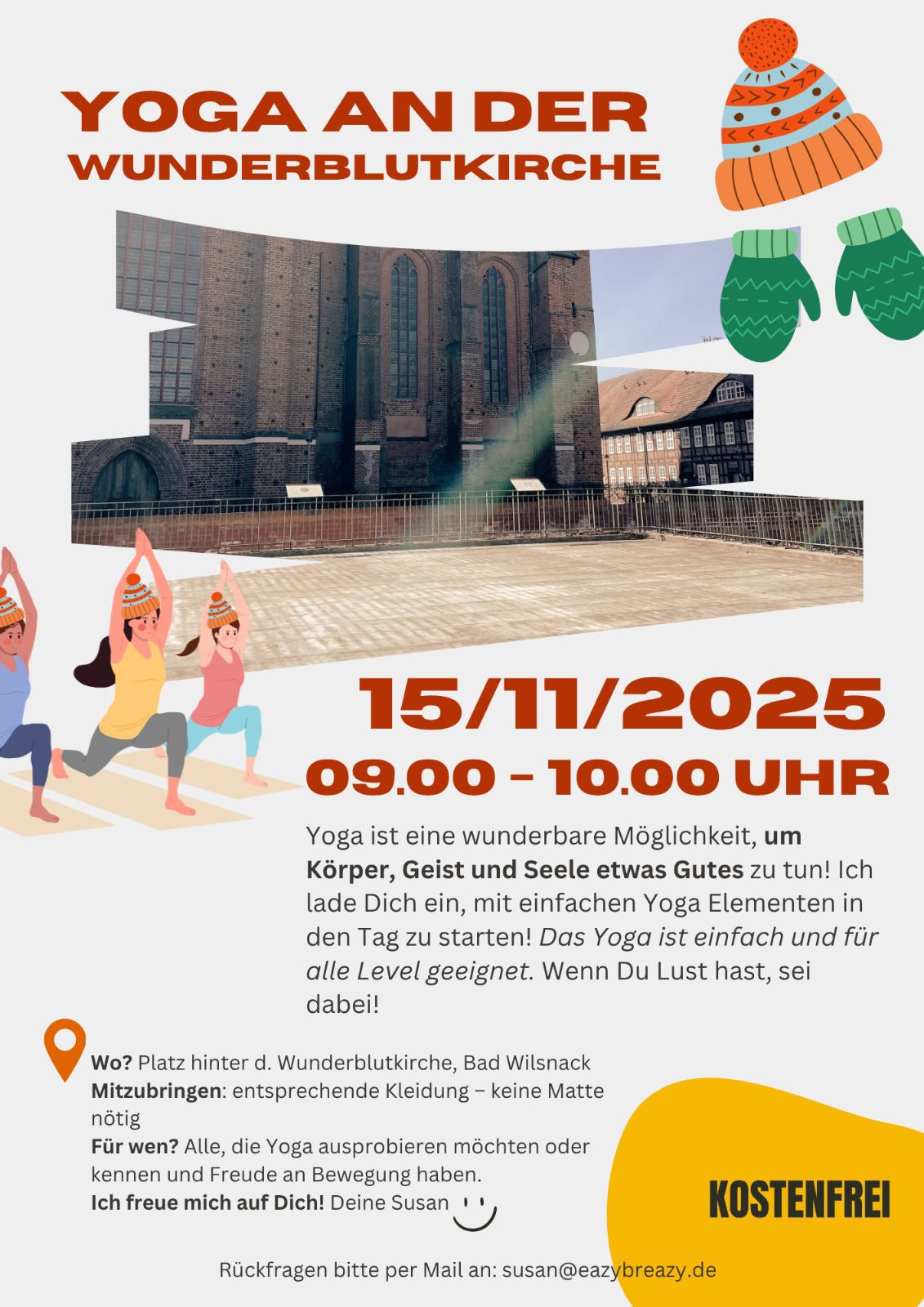Starte entspannt in den Tag – mit einer Yogaeinheit hinter der Wunderblutkirche in Bad Wilsnack. Der Workshop ist offen für alle, die Yoga einfach mal ausprobieren oder bereits Bekanntes vertiefen möchten. Mit einfachen Bewegungen und Atemübungen unterstützt dich Yoga dabei, Körper, Geist und Seele in Einklang zu bringen.